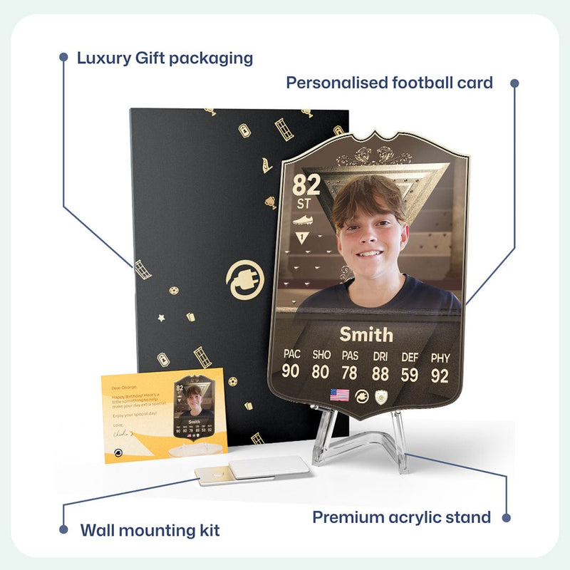 When it comes to personalising your card, the basic steps are to upload a photo and add a name to your card. Then you’ll add details like your player’s position and skill ratings out of 99 for each football skill shown on the card. Our online card builder makes this really easy. And if you aren’t a football card expert, don’t worry!