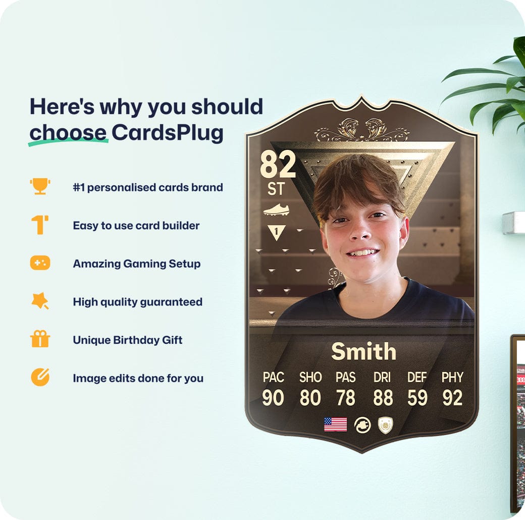 CardsPlug is home to the world’s favourite personalised football cards. Our easy football card builder lets you make a real life football card with your own name, photo, and skill ratings. With 100+ designs to choose from and some inspired by EA SPORTS FC 26 cards seen in EA FC 26, EA FC 25 and FC 24 as well as FIFA cards seen in games like FIFA 23 and FIFA 22.