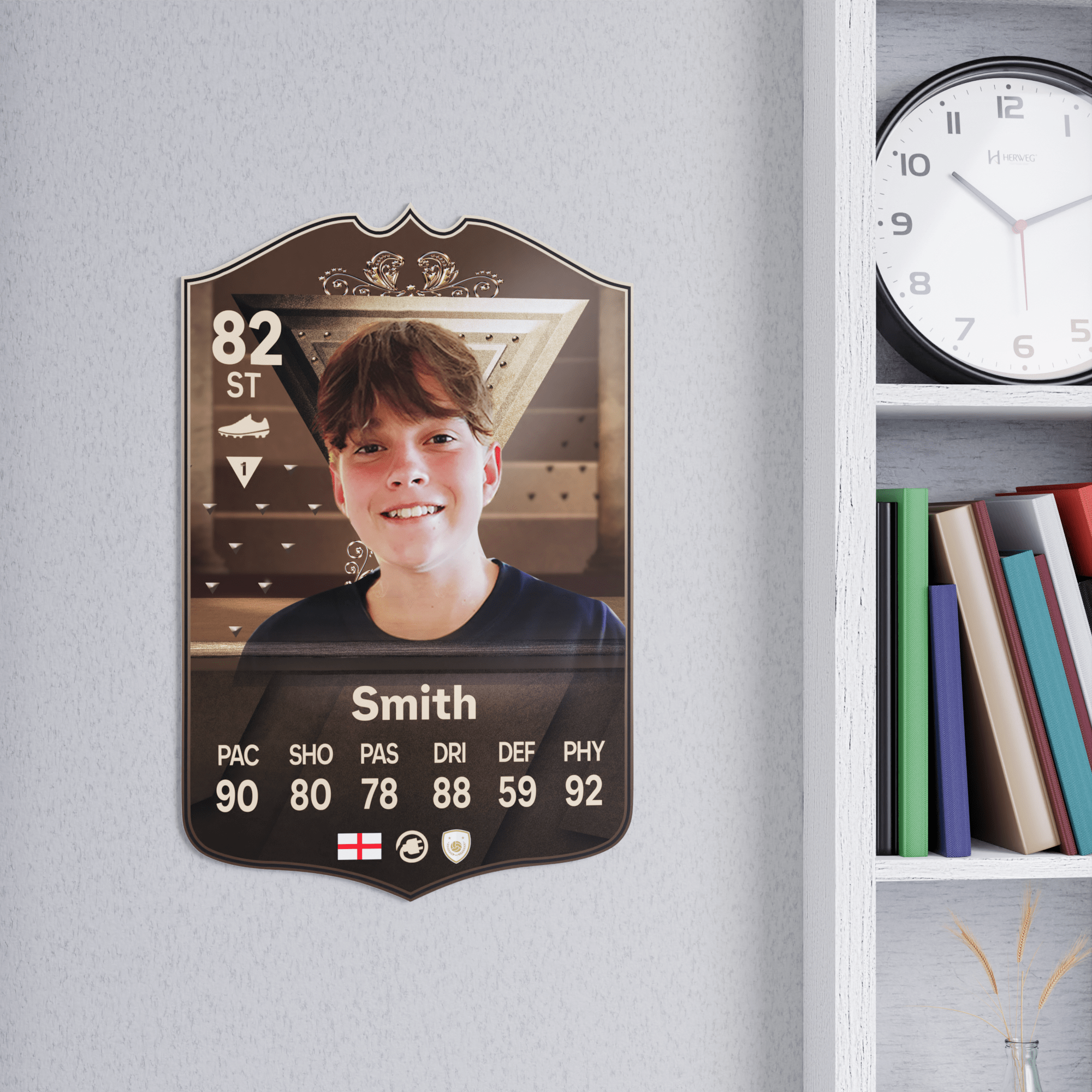 Our football card builder lets you choose between two different card materials. Our Standard cards are made of a ultra-strong variety of Foamex (not cardboard or foam!). This material has a lovely gloss finish and is also super durable. Our world-exclusive Metal football cards have a matte finish and are slightly heavier. Both look amazing and will last forever.