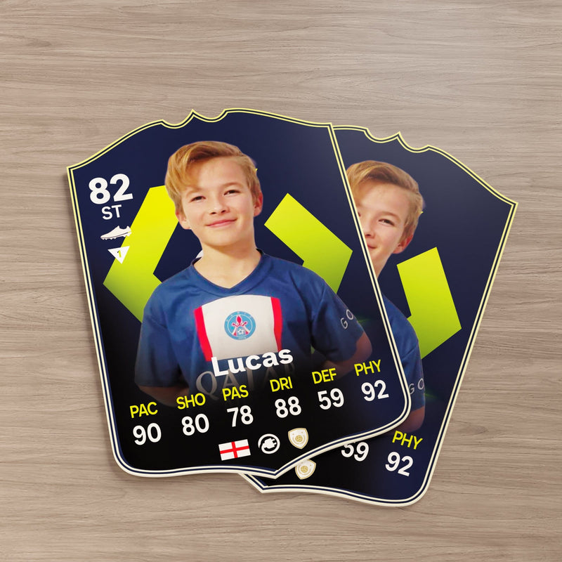 When it comes to personalising your card, the basic steps are to upload a photo and add a name to your card. Then you’ll add details like your player’s position and skill ratings out of 99 for each football skill shown on the card. Our online card builder makes this really easy. And if you aren’t a football card expert, don’t worry!