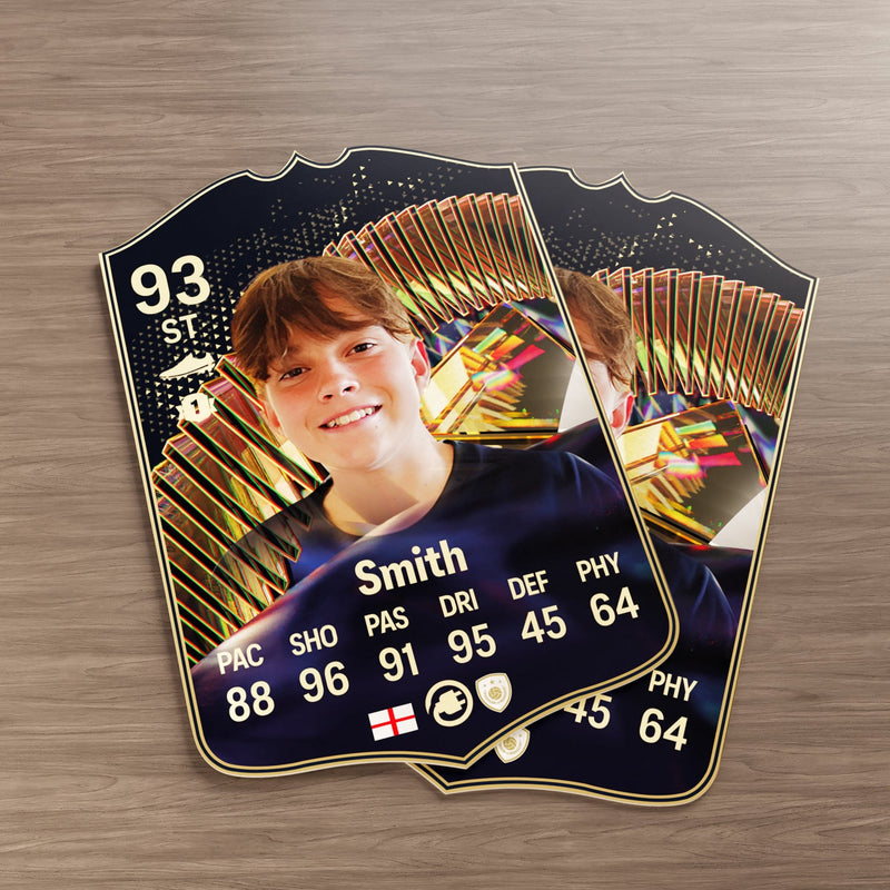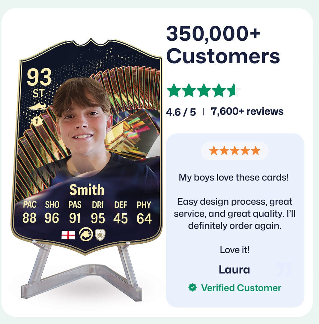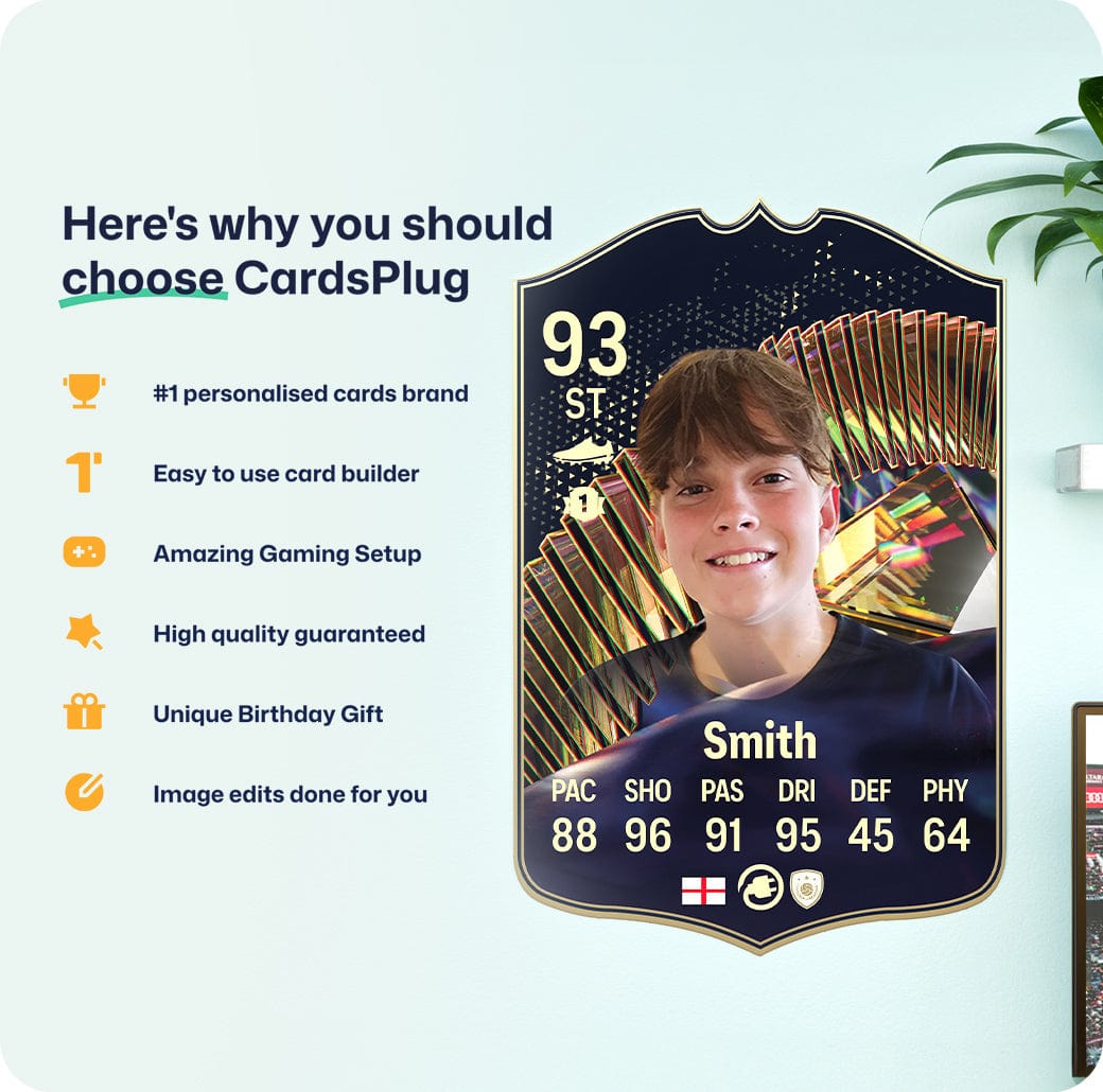 CardsPlug is home to the world’s favourite personalised football cards. Our easy football card builder lets you make a real life football card with your own name, photo, and skill ratings. With 100+ designs to choose from and some inspired by EA SPORTS FC 26 cards seen in EA FC 26, EA FC 25 and FC 24 as well as FIFA cards seen in games like FIFA 23 and FIFA 22.