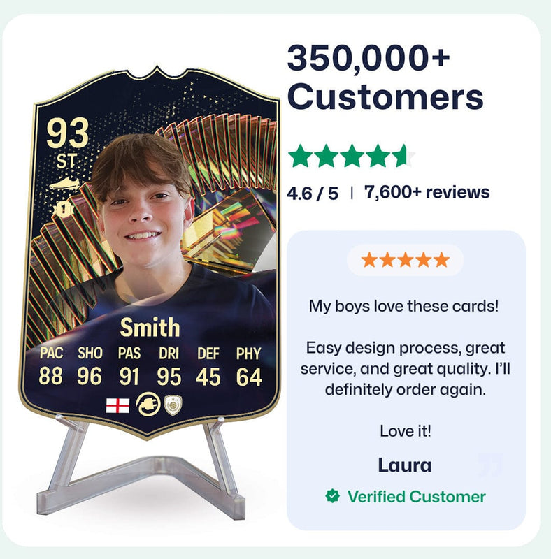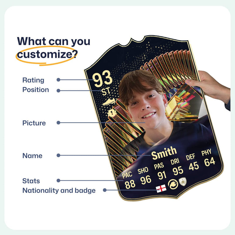 Yes! Our football card designers will remove the background from the photo you upload so it looks just like the football cards you might’ve seen games like EA FC 25, EA FC 24 or FIFA. We’ll also position the photo perfectly on the football card so it looks great. If there are any problems with the quality of your photo, we’ll reach out and let you know. Plus, our website's AI will remove the background on the image for visual purposes before purchase so you can see it without a background on the card.