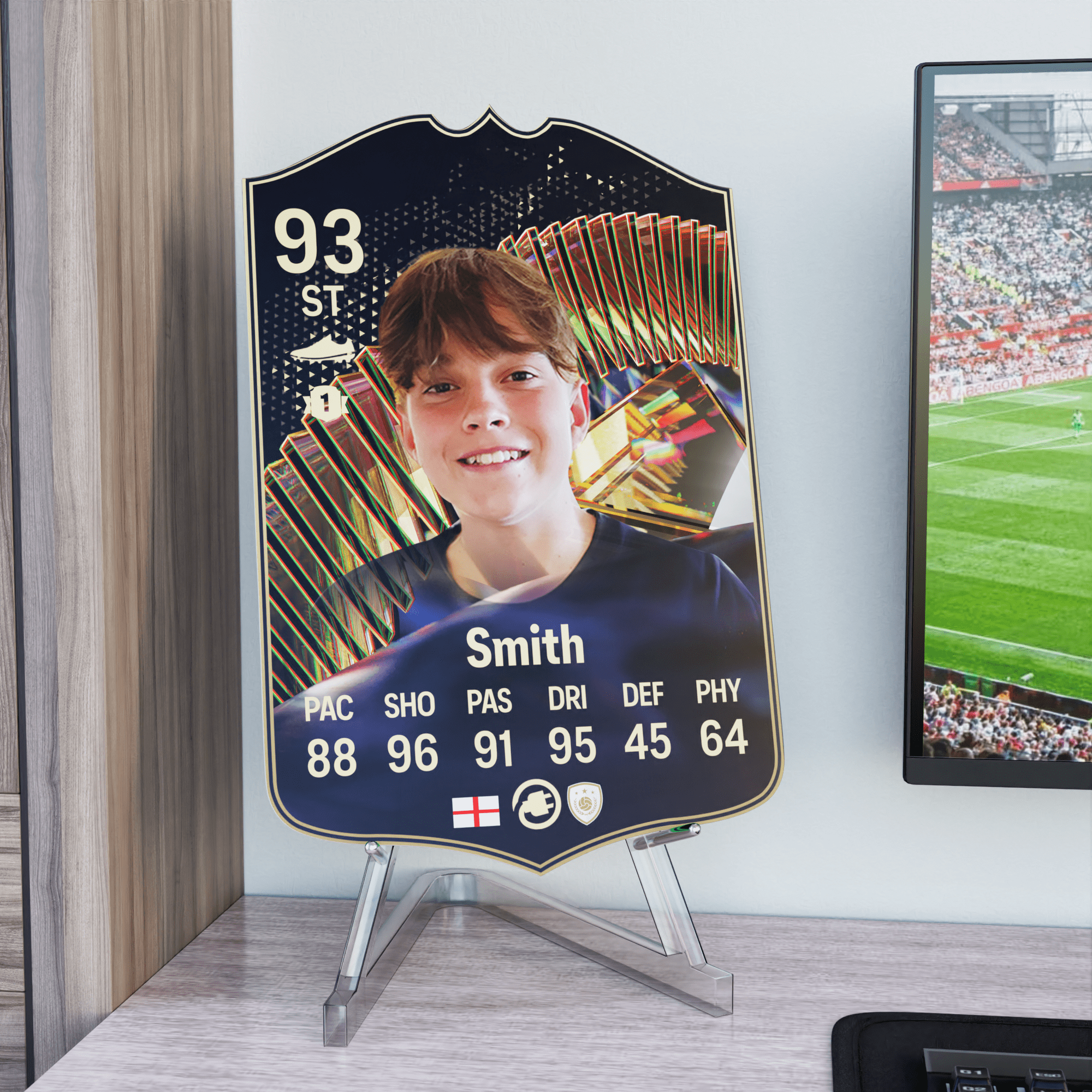 When it comes to personalising your card, the basic steps are to upload a photo and add a name to your card. Then you’ll add details like your player’s position and skill ratings out of 99 for each football skill shown on the card. Our online card builder makes this really easy. And if you aren’t a football card expert, don’t worry!