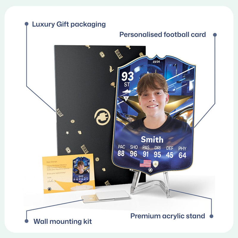 CardsPlug is home to the world’s favourite personalised football cards. Our easy football card builder lets you make a real life football card with your own name, photo, and skill ratings. With 100+ designs to choose from and some inspired by EA SPORTS FC 26 cards seen in EA FC 26, EA FC 25 and FC 24 as well as FIFA cards seen in games like FIFA 23 and FIFA 22.