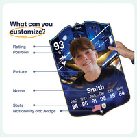 When it comes to personalising your card, the basic steps are to upload a photo and add a name to your card. Then you’ll add details like your player’s position and skill ratings out of 99 for each football skill shown on the card. Our online card builder makes this really easy. And if you aren’t a football card expert, don’t worry!