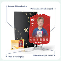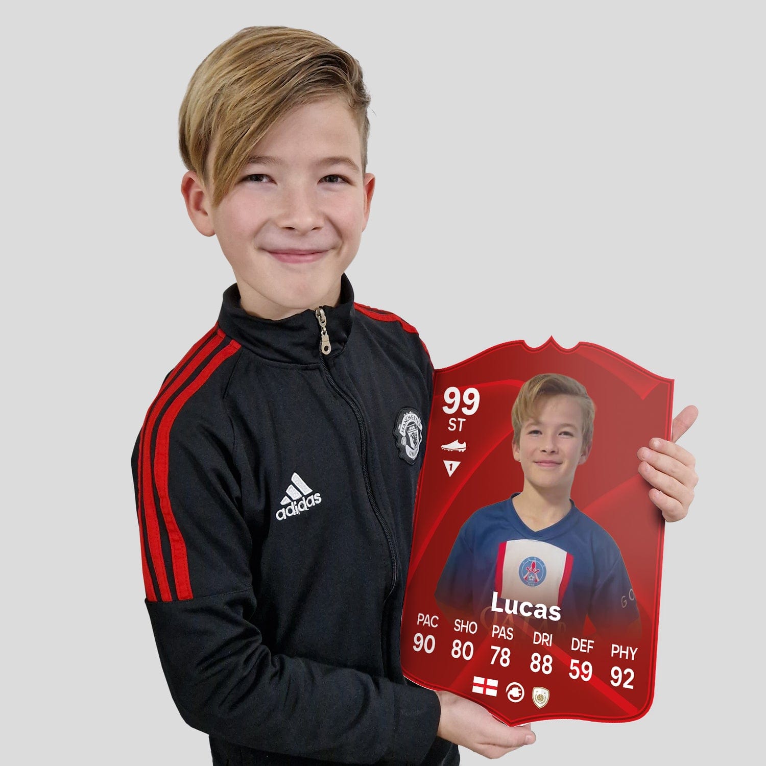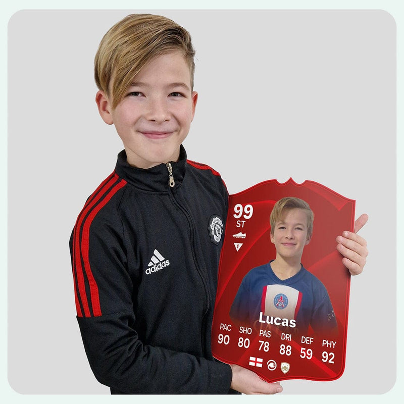 When it comes to personalising your card, the basic steps are to upload a photo and add a name to your card. Then you’ll add details like your player’s position and skill ratings out of 99 for each football skill shown on the card. Our online card builder makes this really easy. And if you aren’t a football card expert, don’t worry!