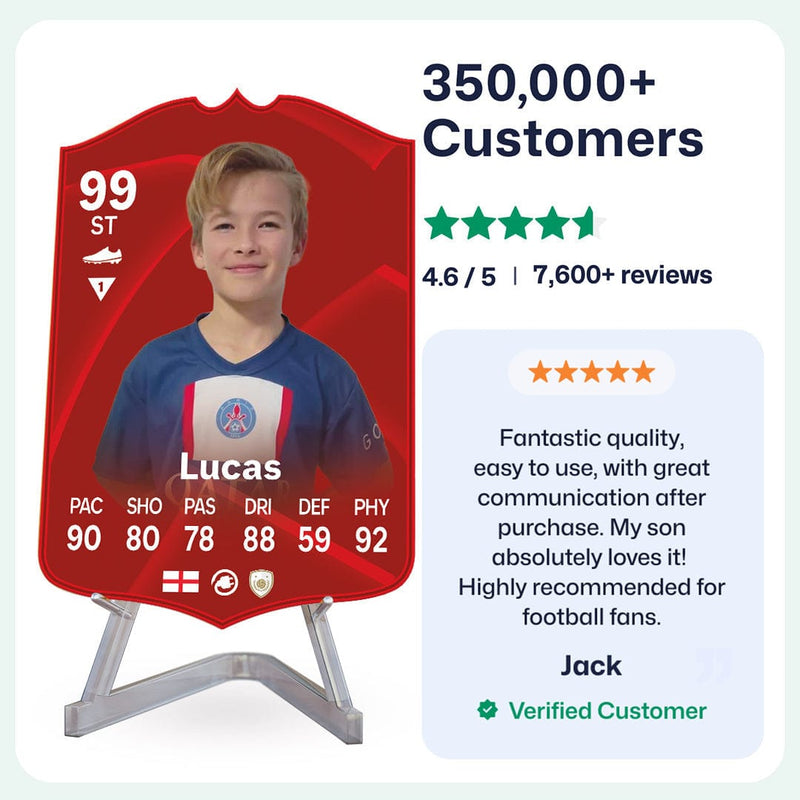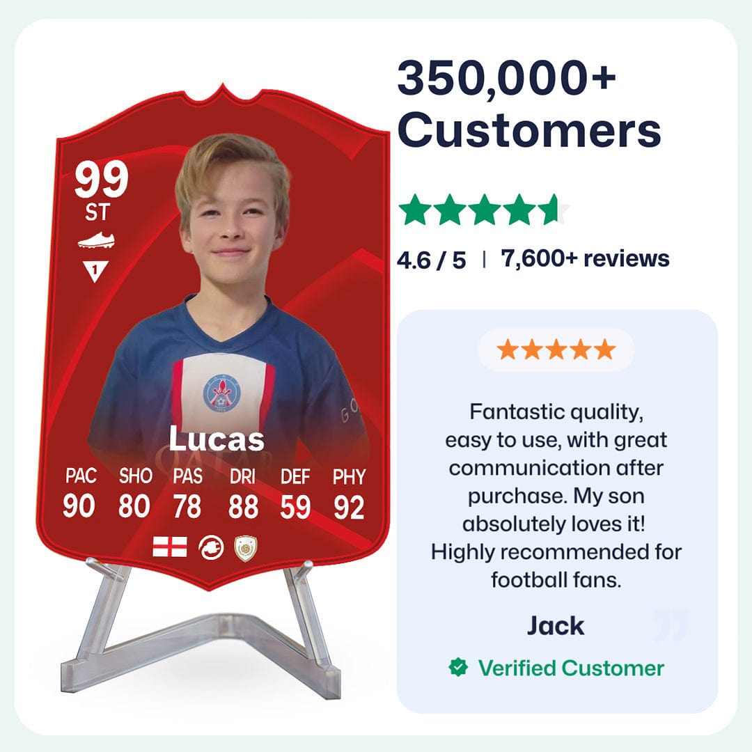 Yes! Our football card designers will remove the background from the photo you upload so it looks just like the football cards you might’ve seen games like EA FC 25, EA FC 24 or FIFA. We’ll also position the photo perfectly on the football card so it looks great. If there are any problems with the quality of your photo, we’ll reach out and let you know. Plus, our website's AI will remove the background on the image for visual purposes before purchase so you can see it without a background on the card.
