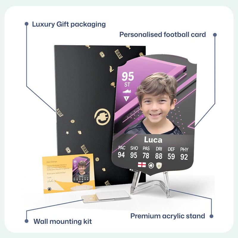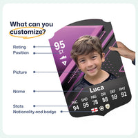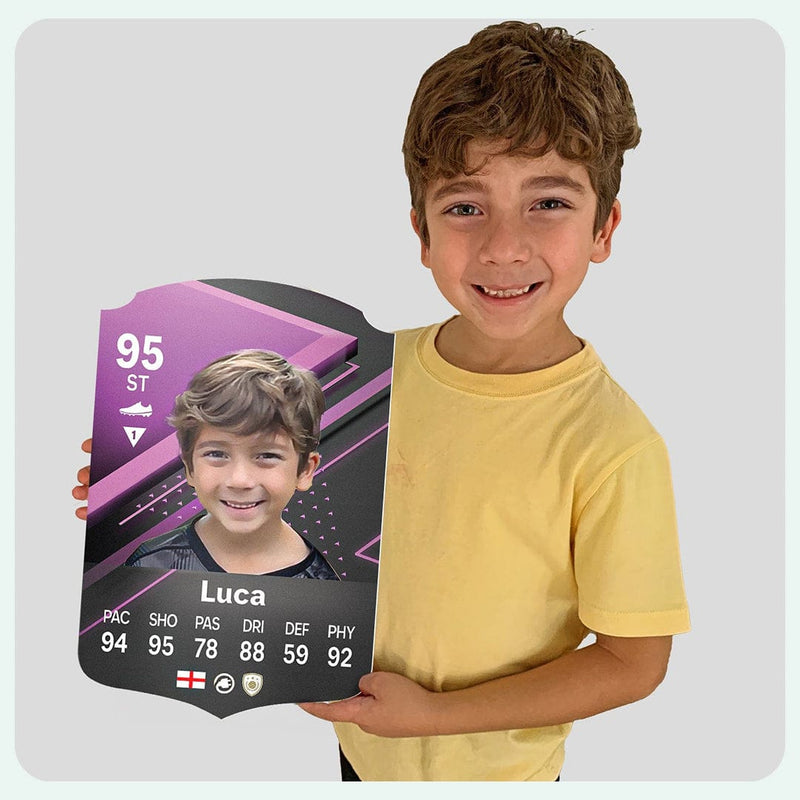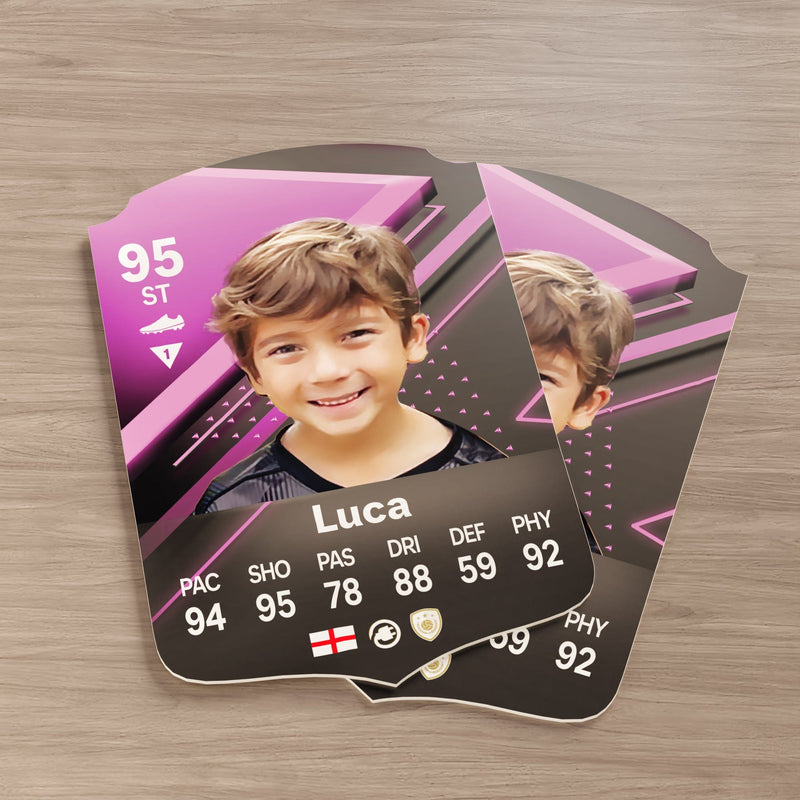 When it comes to personalising your card, the basic steps are to upload a photo and add a name to your card. Then you’ll add details like your player’s position and skill ratings out of 99 for each football skill shown on the card. Our online card builder makes this really easy. And if you aren’t a football card expert, don’t worry!