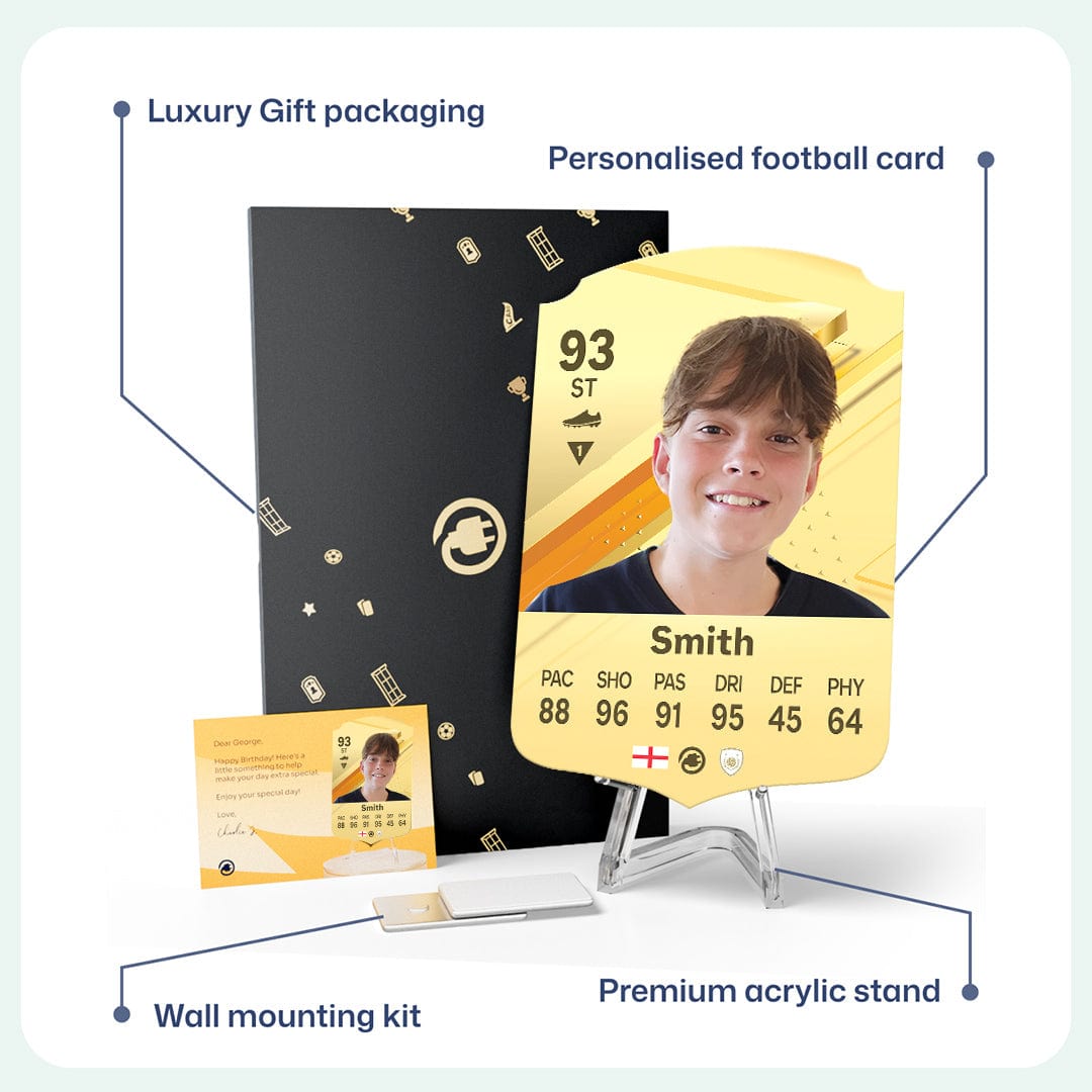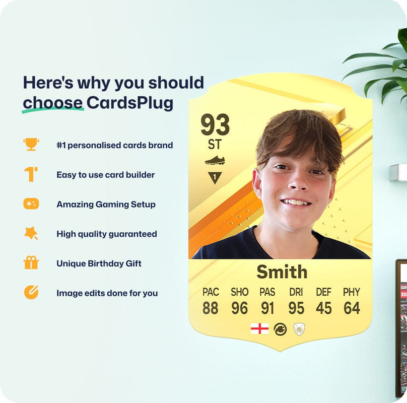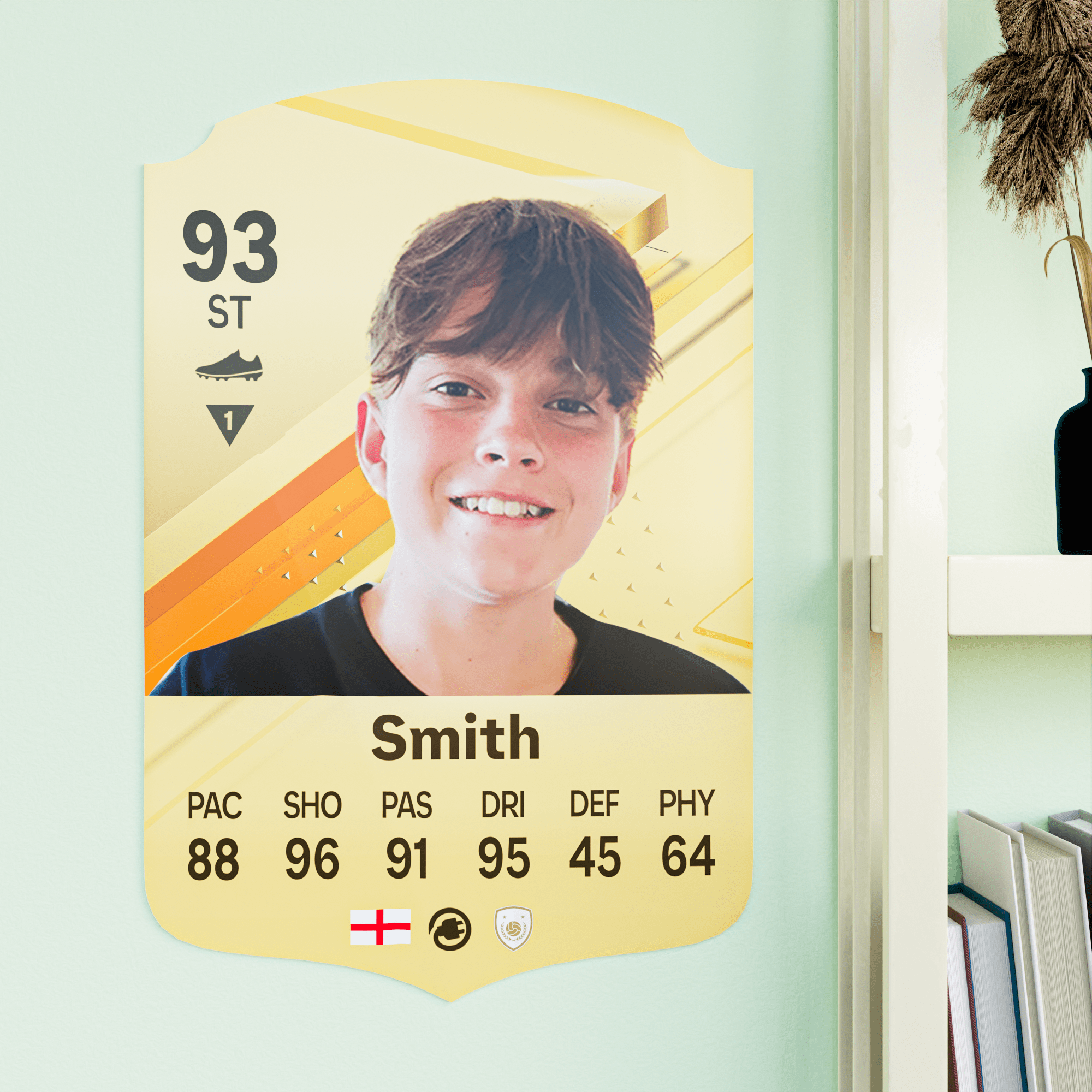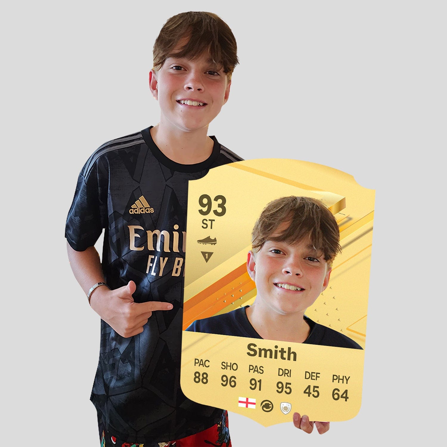 When it comes to personalising your card, the basic steps are to upload a photo and add a name to your card. Then you’ll add details like your player’s position and skill ratings out of 99 for each football skill shown on the card. Our online card builder makes this really easy. And if you aren’t a football card expert, don’t worry!