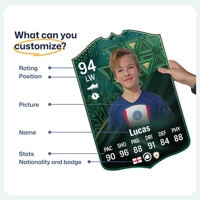 When it comes to personalising your card, the basic steps are to upload a photo and add a name to your card. Then you’ll add details like your player’s position and skill ratings out of 99 for each football skill shown on the card. Our online card builder makes this really easy. And if you aren’t a football card expert, don’t worry!