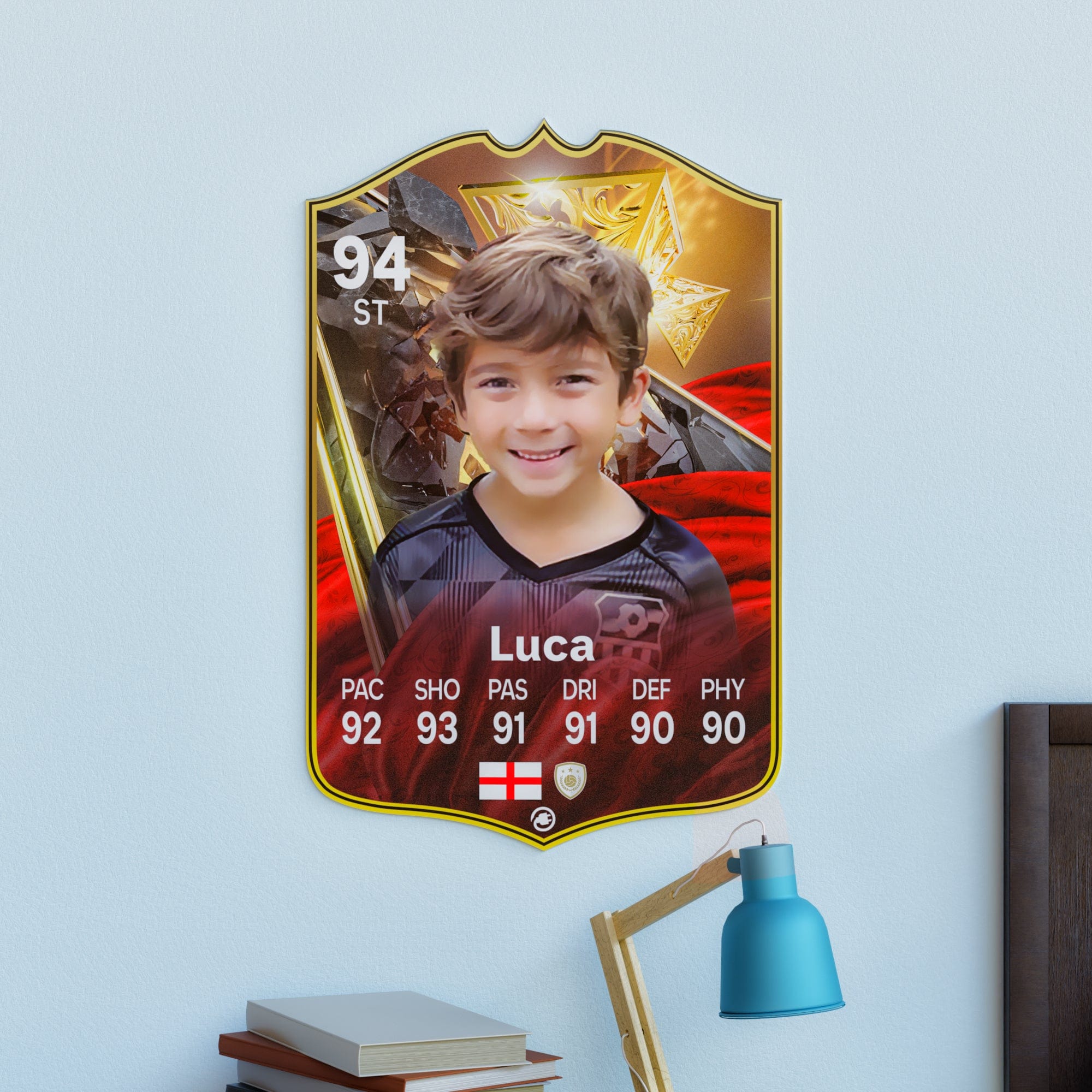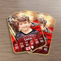 When it comes to personalising your card, the basic steps are to upload a photo and add a name to your card. Then you’ll add details like your player’s position and skill ratings out of 99 for each football skill shown on the card. Our online card builder makes this really easy. And if you aren’t a football card expert, don’t worry!