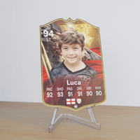 Our football card builder lets you choose between two different card materials. Our Standard cards are made of a ultra-strong variety of Foamex (not cardboard or foam!). This material has a lovely gloss finish and is also super durable. Our world-exclusive Metal football cards have a matte finish and are slightly heavier. Both look amazing and will last forever.