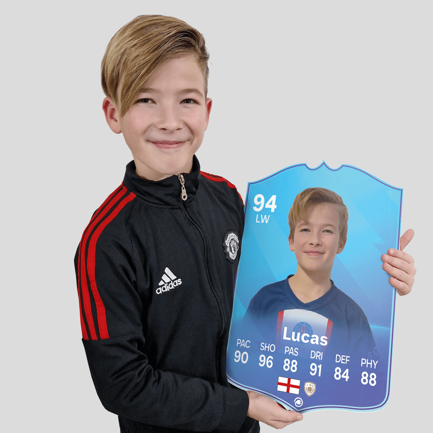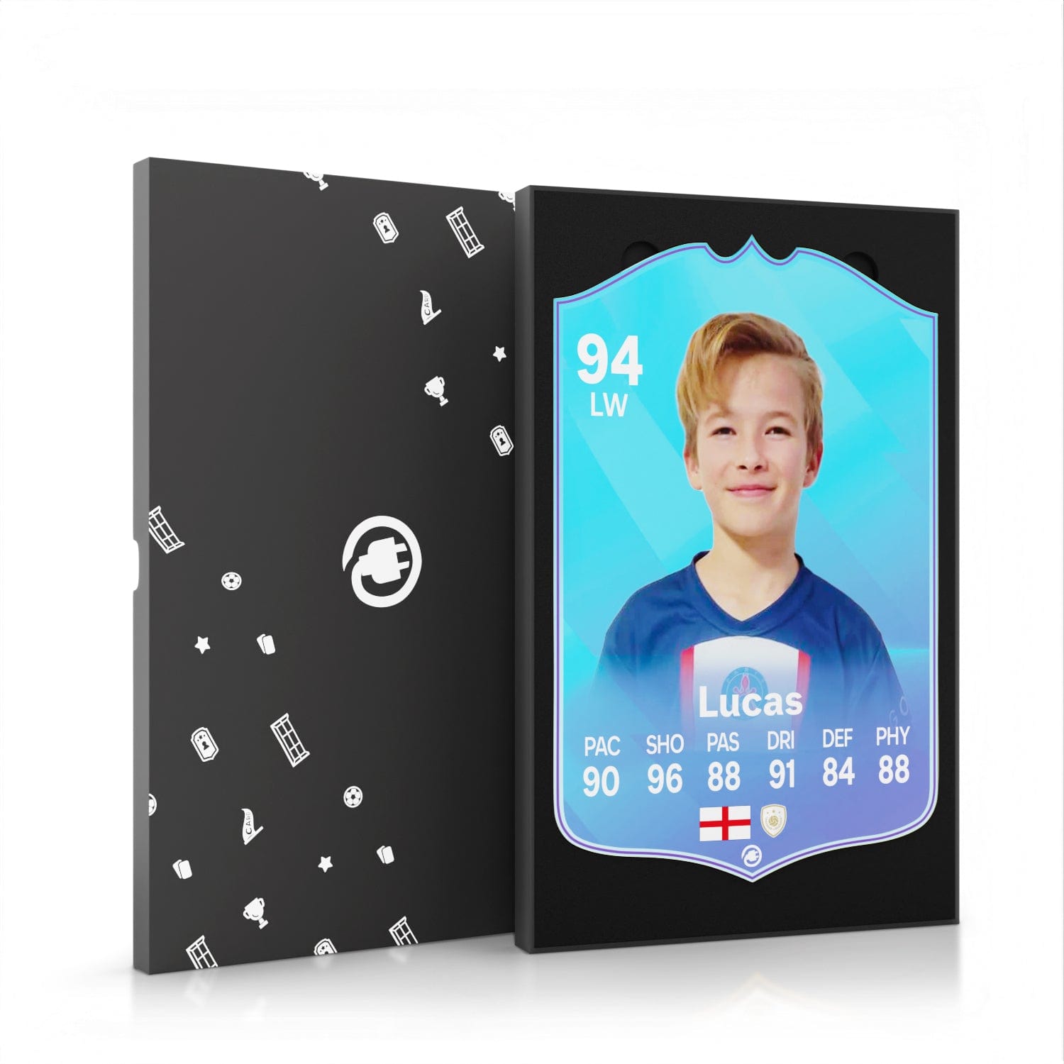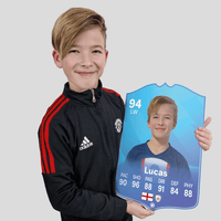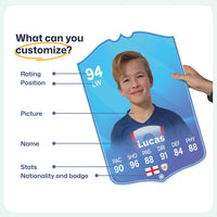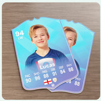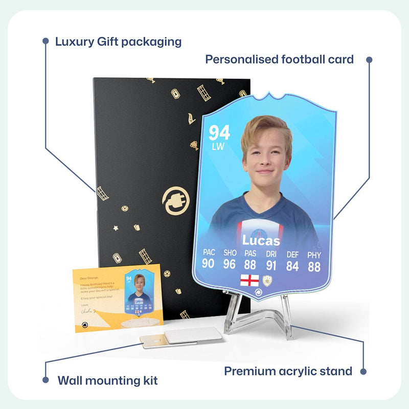 When it comes to personalising your card, the basic steps are to upload a photo and add a name to your card. Then you’ll add details like your player’s position and skill ratings out of 99 for each football skill shown on the card. Our online card builder makes this really easy. And if you aren’t a football card expert, don’t worry!