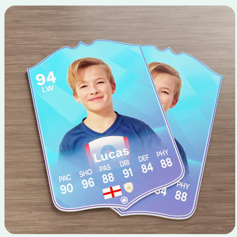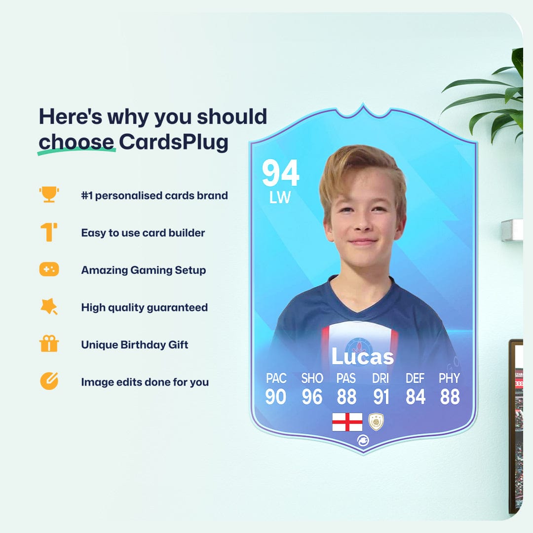 CardsPlug is home to the world’s favourite personalised football cards. Our easy football card builder lets you make a real life football card with your own name, photo, and skill ratings. With 100+ designs to choose from and some inspired by EA SPORTS FC 26 cards seen in EA FC 26, EA FC 25 and FC 24 as well as FIFA cards seen in games like FIFA 23 and FIFA 22.