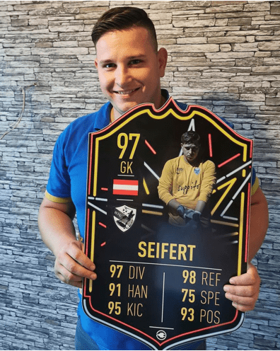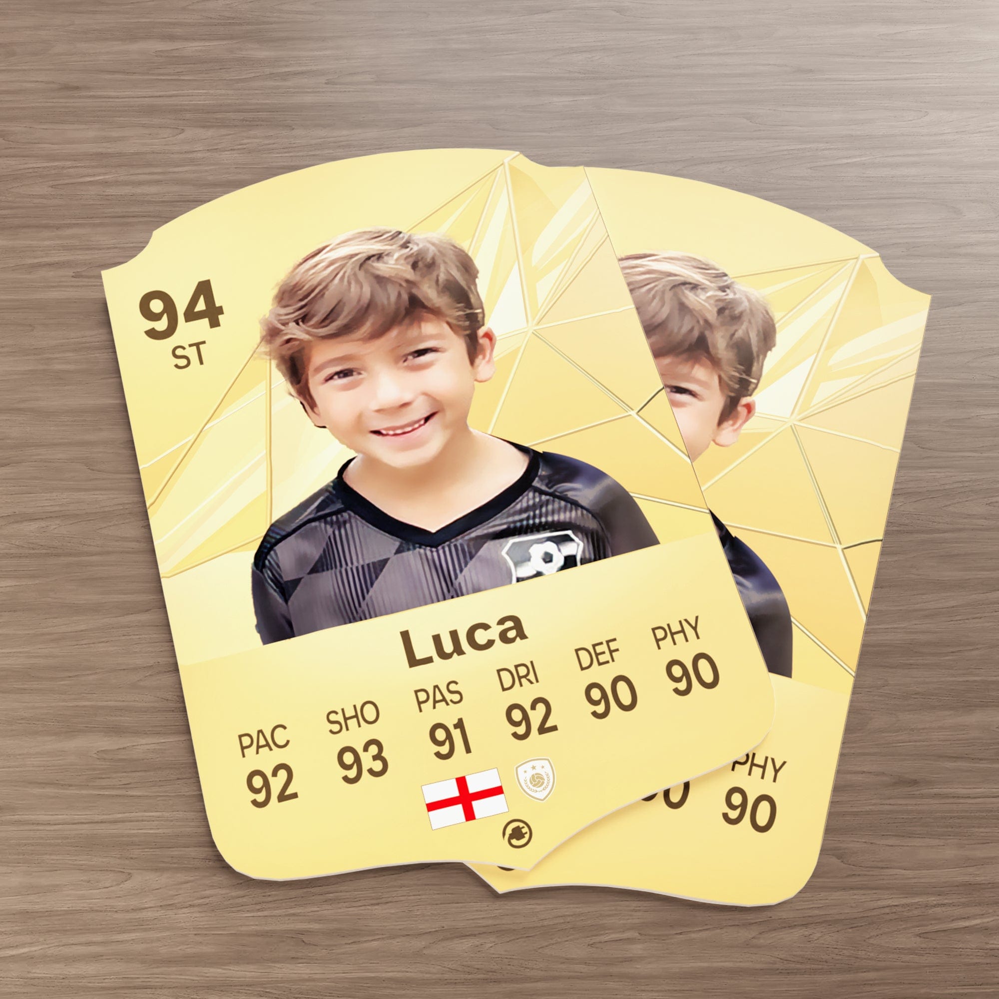 Our football card builder lets you choose between two different card materials. Our Standard cards are made of a ultra-strong variety of Foamex (not cardboard or foam!). This material has a lovely gloss finish and is also super durable. Our world-exclusive Metal football cards have a matte finish and are slightly heavier. Both look amazing and will last forever.