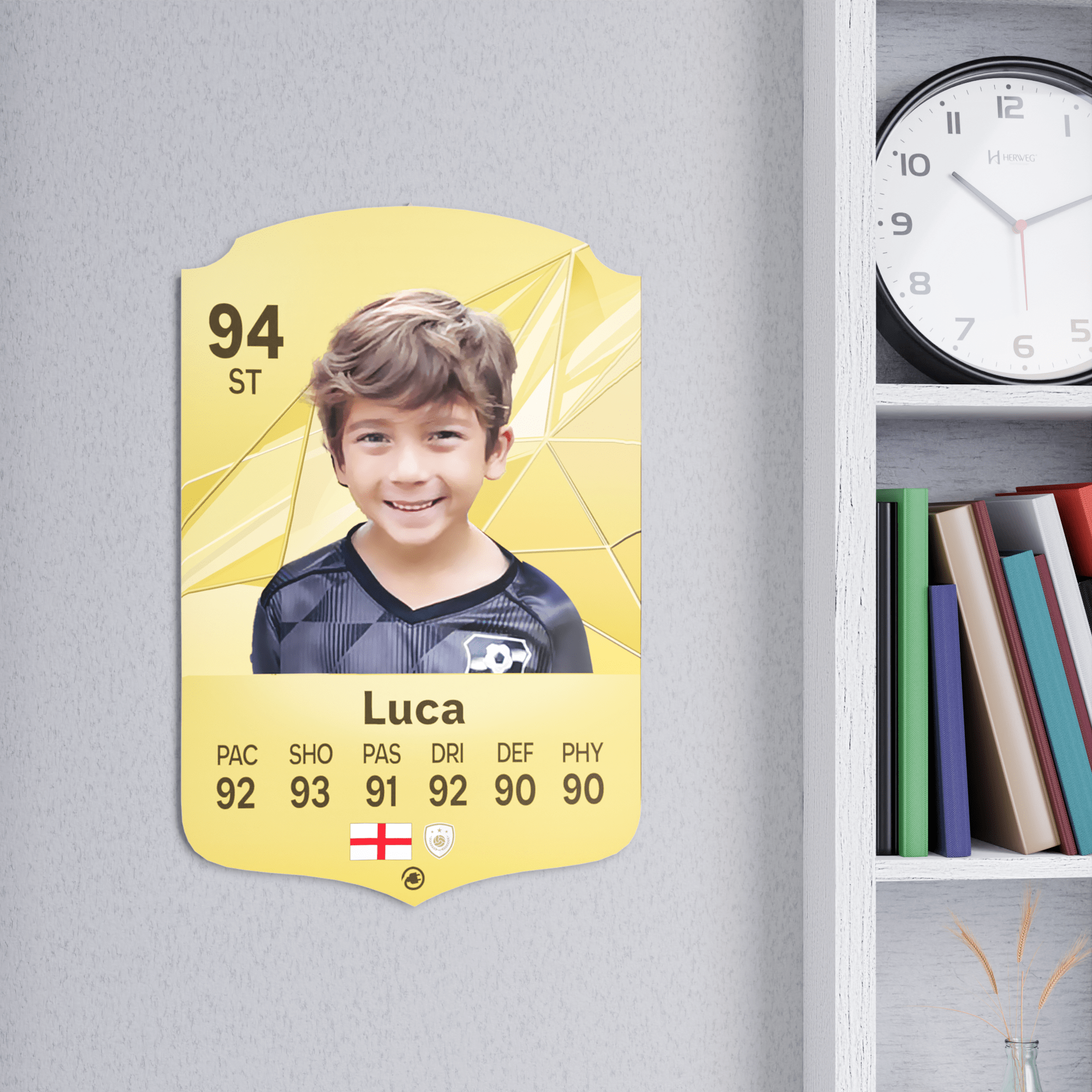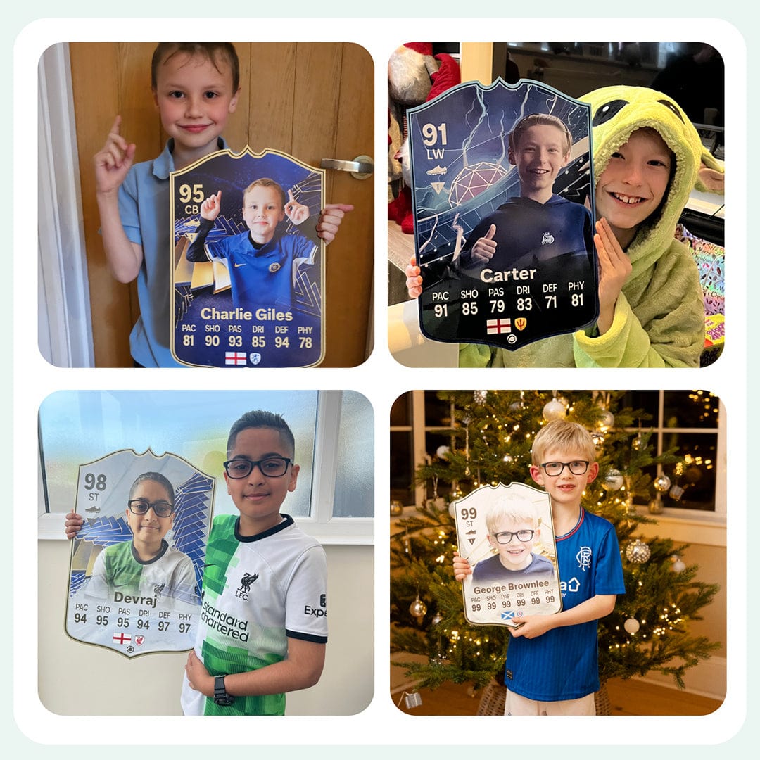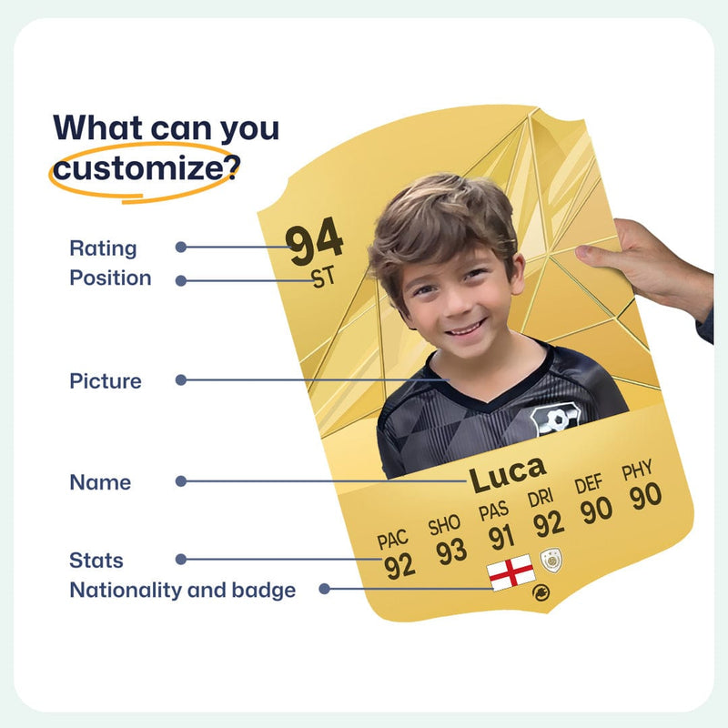 When it comes to personalising your card, the basic steps are to upload a photo and add a name to your card. Then you’ll add details like your player’s position and skill ratings out of 99 for each football skill shown on the card. Our online card builder makes this really easy. And if you aren’t a football card expert, don’t worry!