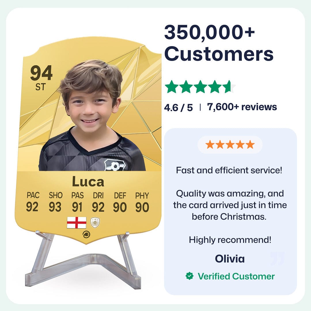 Once you’ve personalised your card, our design experts will edit your photo, design your card, and bring it to life in stunning quality. You’ll get a full preview before we print your card and every card’s quality is backed by our Gold Standard Guarantee. So far, over 350,000+ football fans agree: A CardsPlug football card is the ultimate football gift!