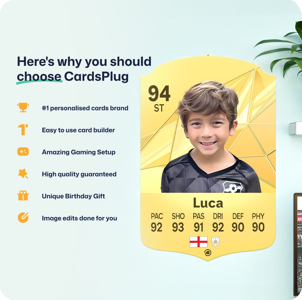 CardsPlug is home to the world’s favourite personalised football cards. Our easy football card builder lets you make a real life football card with your own name, photo, and skill ratings. With 100+ designs to choose from and some inspired by EA SPORTS FC 26 cards seen in EA FC 26, EA FC 25 and FC 24 as well as FIFA cards seen in games like FIFA 23 and FIFA 22.