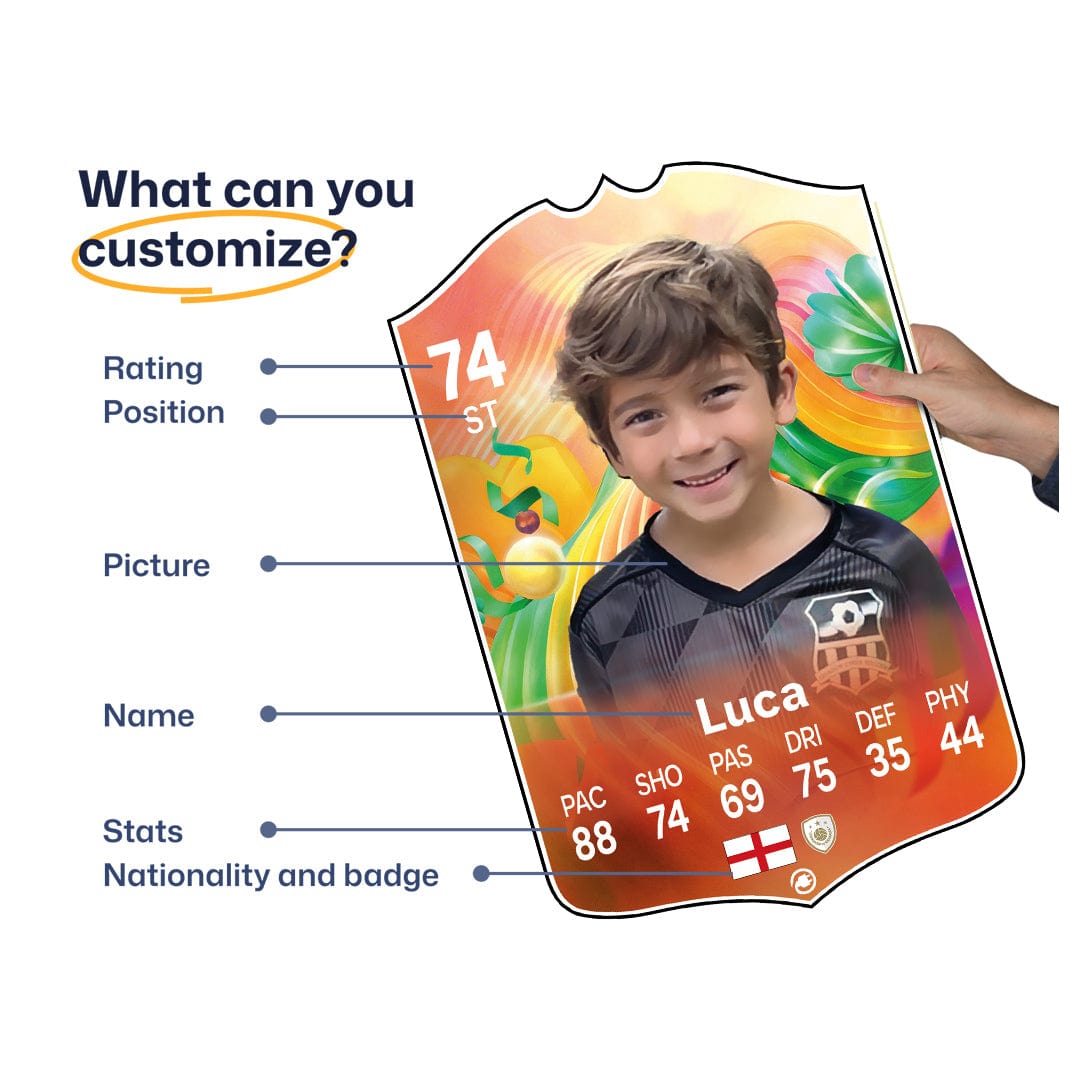 When it comes to personalising your card, the basic steps are to upload a photo and add a name to your card. Then you’ll add details like your player’s position and skill ratings out of 99 for each football skill shown on the card. Our online card builder makes this really easy. And if you aren’t a football card expert, don’t worry!