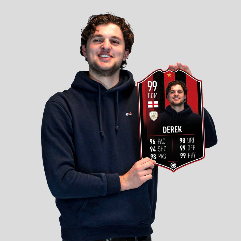 When it comes to personalising your card, the basic steps are to upload a photo and add a name to your card. Then you’ll add details like your player’s position and skill ratings out of 99 for each football skill shown on the card. Our online card builder makes this really easy. And if you aren’t a football card expert, don’t worry!