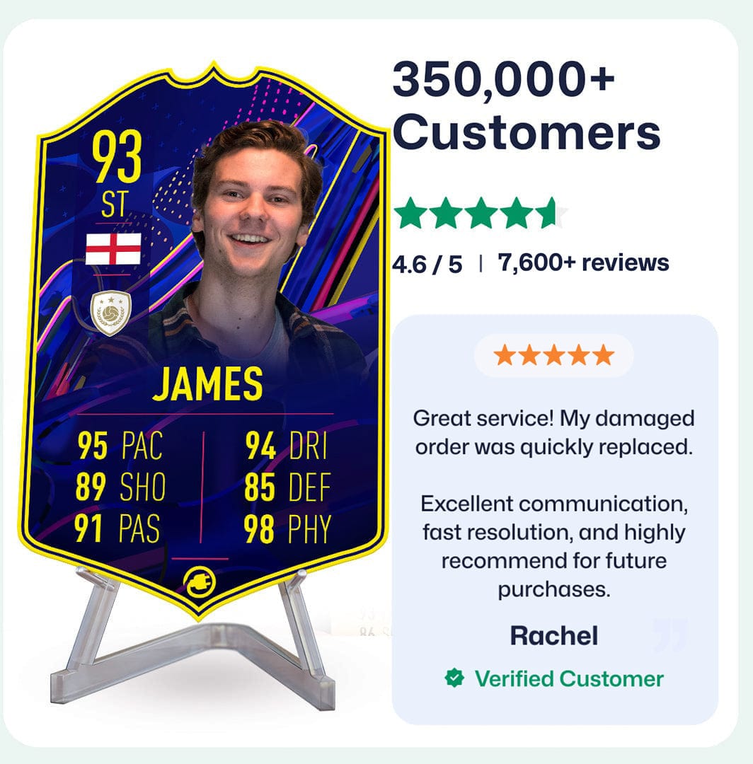 Yes! Our football card designers will remove the background from the photo you upload so it looks just like the football cards you might’ve seen games like EA FC 25, EA FC 24 or FIFA. We’ll also position the photo perfectly on the football card so it looks great. If there are any problems with the quality of your photo, we’ll reach out and let you know. Plus, our website's AI will remove the background on the image for visual purposes before purchase so you can see it without a background on the card.