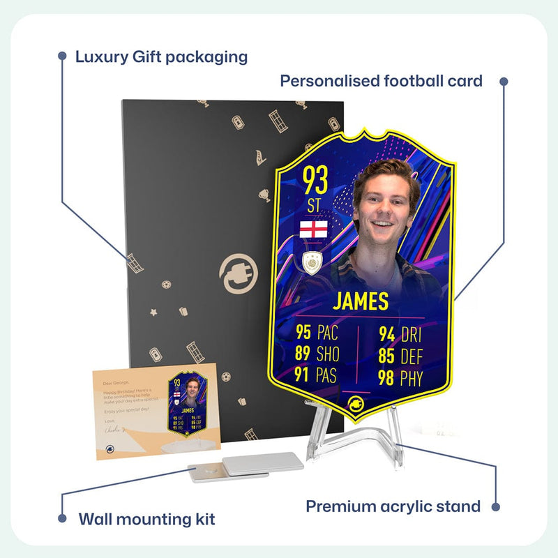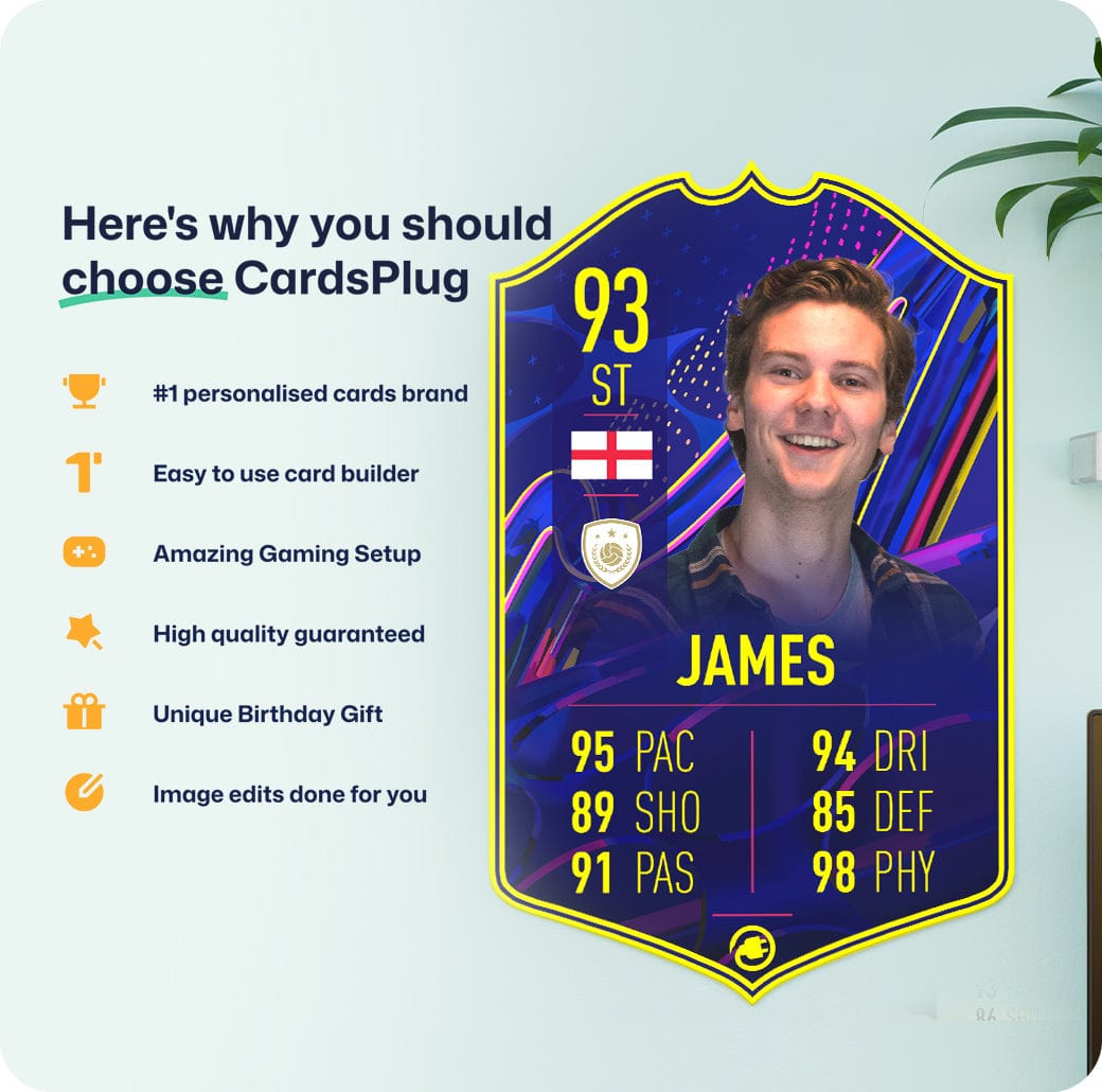 CardsPlug is home to the world’s favourite personalised football cards. Our easy football card builder lets you make a real life football card with your own name, photo, and skill ratings. With 100+ designs to choose from and some inspired by EA SPORTS FC 26 cards seen in EA FC 26, EA FC 25 and FC 24 as well as FIFA cards seen in games like FIFA 23 and FIFA 22.