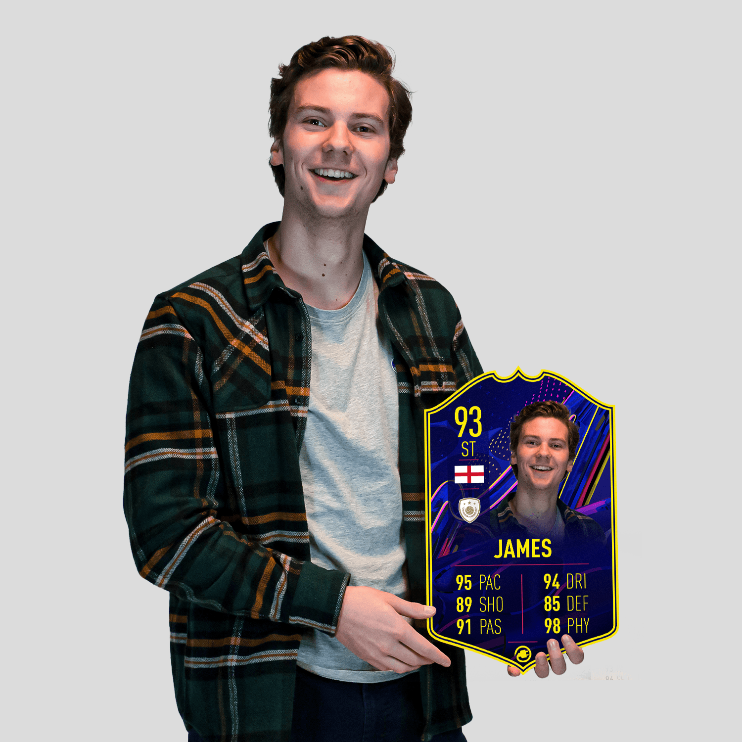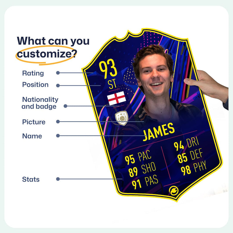 When it comes to personalising your card, the basic steps are to upload a photo and add a name to your card. Then you’ll add details like your player’s position and skill ratings out of 99 for each football skill shown on the card. Our online card builder makes this really easy. And if you aren’t a football card expert, don’t worry!