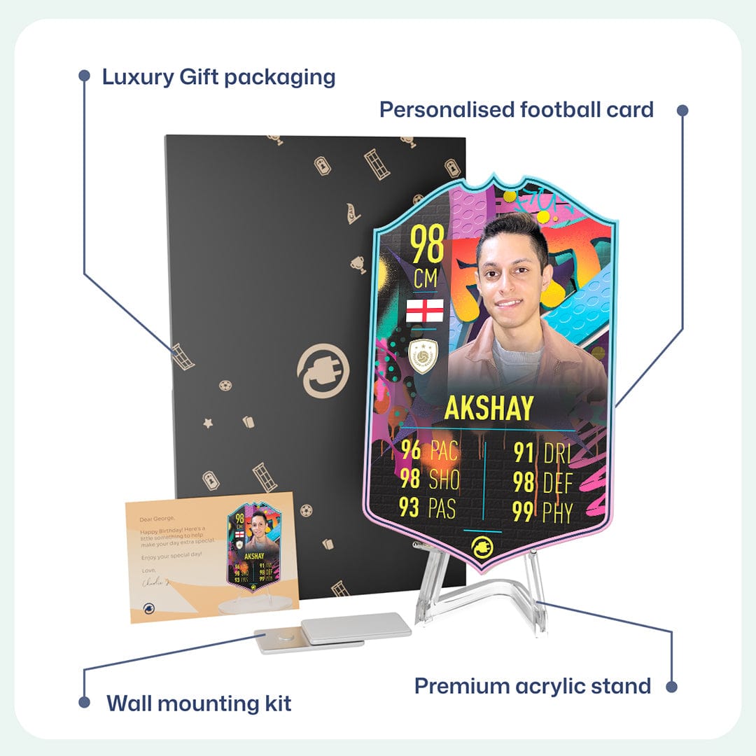 When it comes to personalising your card, the basic steps are to upload a photo and add a name to your card. Then you’ll add details like your player’s position and skill ratings out of 99 for each football skill shown on the card. Our online card builder makes this really easy. And if you aren’t a football card expert, don’t worry!