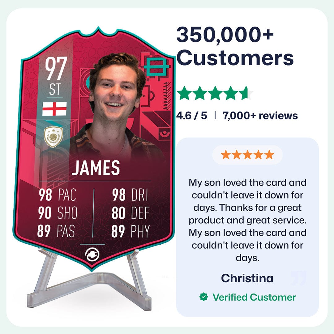Once you’ve personalised your card, our design experts will edit your photo, design your card, and bring it to life in stunning quality. You’ll get a full preview before we print your card and every card’s quality is backed by our Gold Standard Guarantee. So far, over 350,000+ football fans agree: A CardsPlug football card is the ultimate football gift!