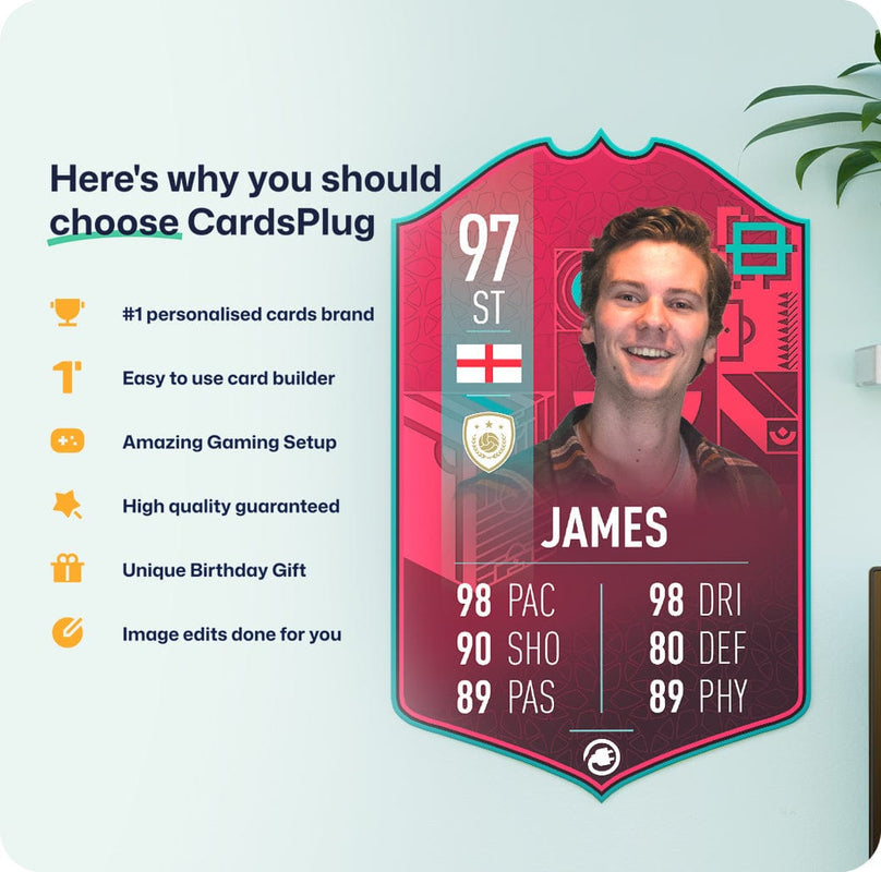 CardsPlug is home to the world’s favourite personalised football cards. Our easy football card builder lets you make a real life football card with your own name, photo, and skill ratings. With 100+ designs to choose from and some inspired by EA SPORTS FC 26 cards seen in EA FC 26, EA FC 25 and FC 24 as well as FIFA cards seen in games like FIFA 23 and FIFA 22.