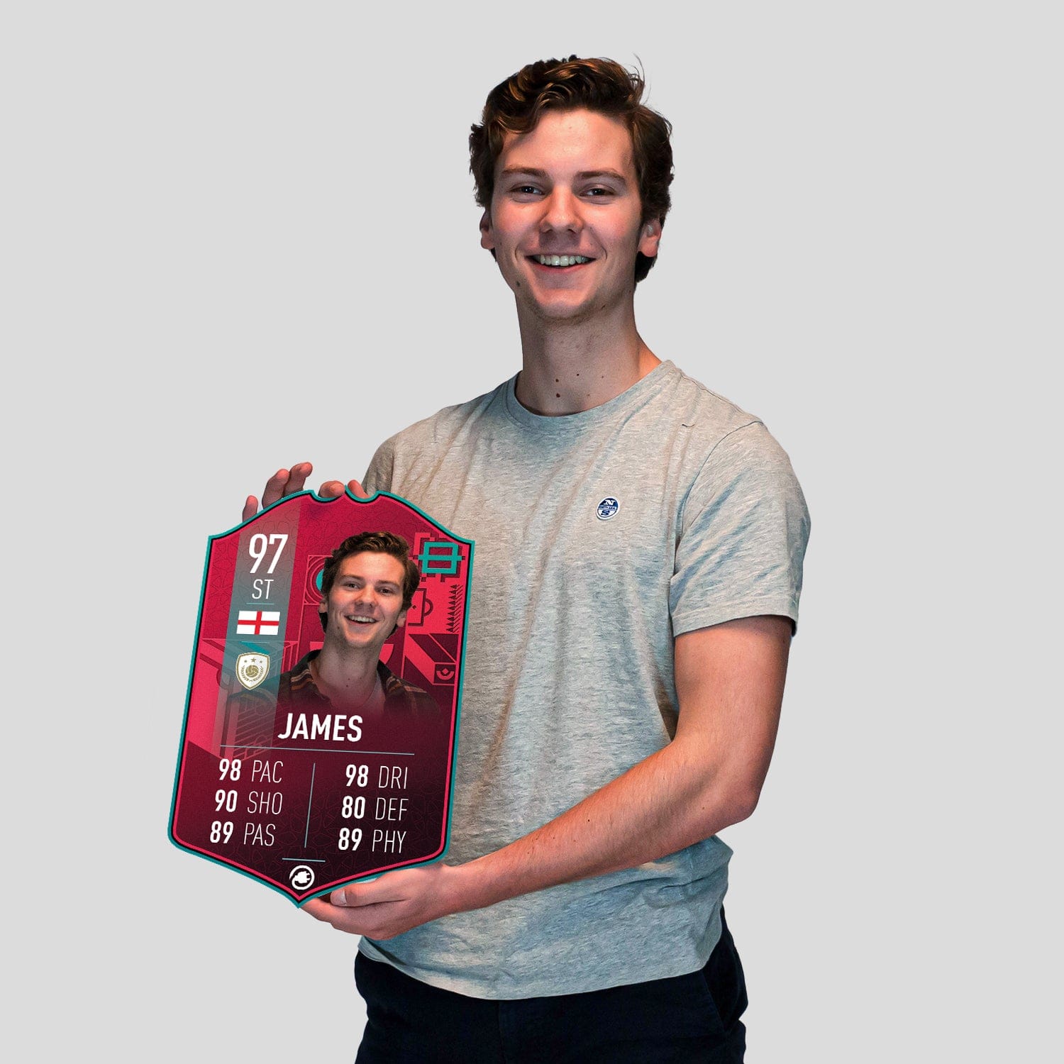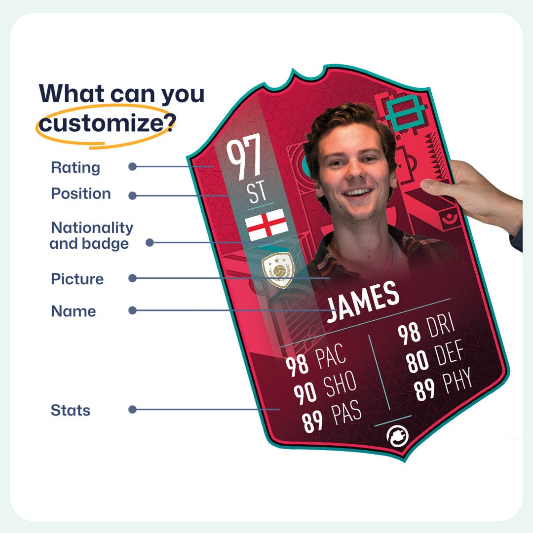 When it comes to personalising your card, the basic steps are to upload a photo and add a name to your card. Then you’ll add details like your player’s position and skill ratings out of 99 for each football skill shown on the card. Our online card builder makes this really easy. And if you aren’t a football card expert, don’t worry!